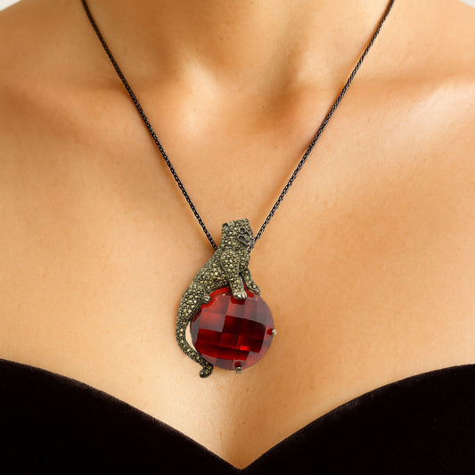 "Power and Passion": Garnet & Marcasite Panther Vintage Silver Pendant.